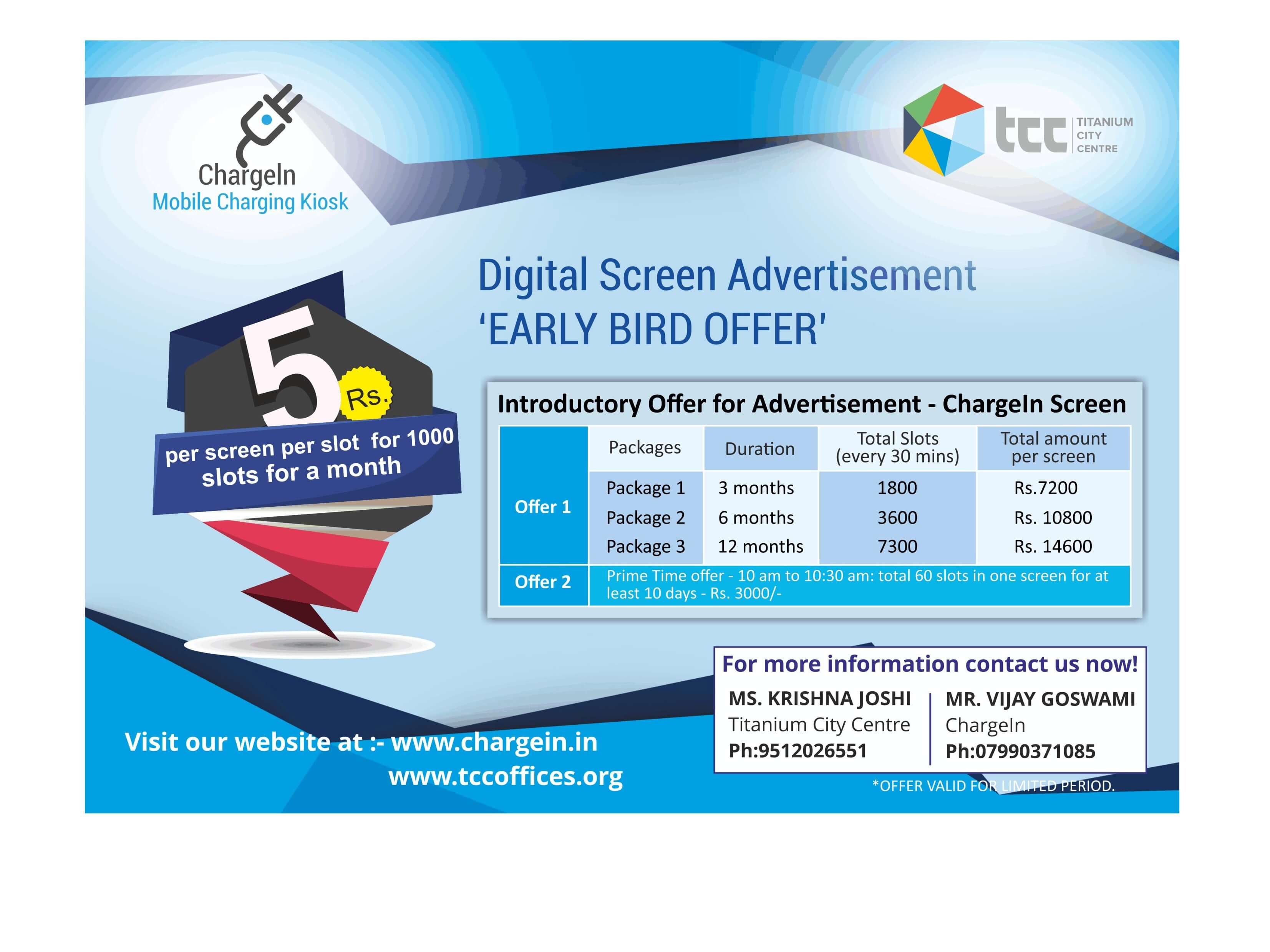 TCC is the largest corporate complex of Ahmedabad and houses variety of product and service providers. It is our greatest pleasure to share on the behalf of TCC management that we have introduced a unique concept of advertisement at TCC campus through the company named ChargIn Kiosk Pvt. Ltd.